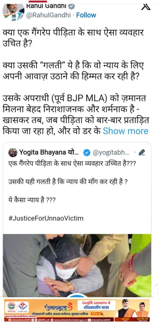 राजनीतिक विश्लेषकों की राय: ‘यह सिर्फ एक केस नहीं’राजनीतिक विश्लेषकों का मानना है कि राहुल गांधी का बयान केवल सरकार पर हमला नहीं, बल्कि न्याय व्यवस्था के प्रति बढ़ते अविश्वास की अभिव्यक्ति है।एक वरिष्ठ राजनीतिक विश्लेषक कहते हैं—“जब एक प्रभावशाली दोषी को राहत मिलती है और पीड़िता बार-बार न्याय की गुहार लगाती है, तो समाज के भीतर यह संदेश जाता है कि ताकतवरों के लिए कानून अलग है।