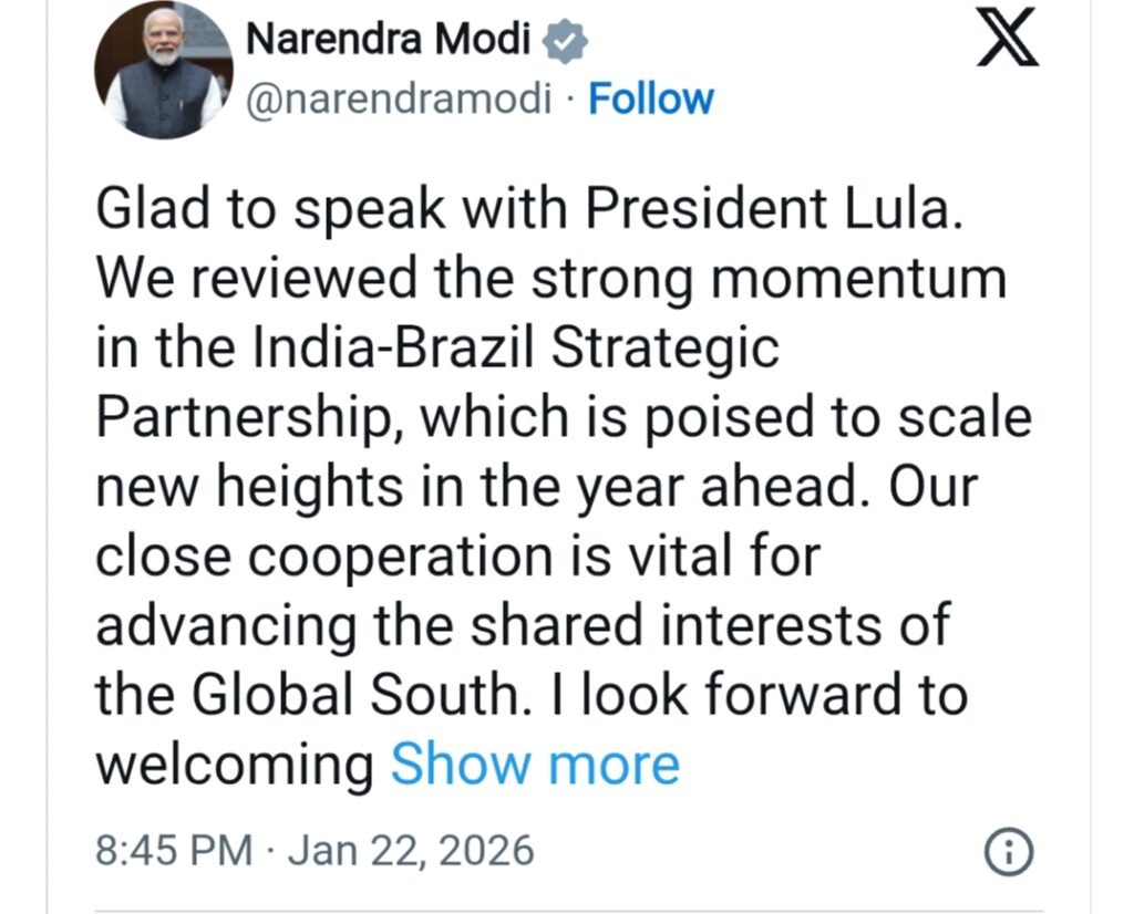 अंतरराष्ट्रीय राजनीति के बदलते परिदृश्य में एक साधारण फोन कॉल भी कई गहरे संकेत दे जाता है। ब्राजील के राष्ट्रपति लुइज इनासियो लूला दा सिल्वा द्वारा प्रधानमंत्री नरेंद्र मोदी को किया गया हालिया फोन कॉल भी कुछ ऐसा ही है। यह बातचीत ऐसे समय हुई है जब अमेरिका के राष्ट्रपति डोनाल्ड ट्रंप ने भारत और ब्राजील—दोनों पर 50 प्रतिशत तक का भारी टैरिफ लगाकर वैश्विक व्यापार व्यवस्था में हलचल पैदा कर दी है।