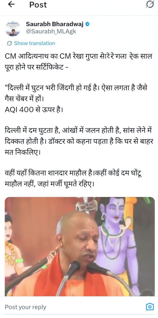 भारद्वाज ने सोशल मीडिया पर लिखा—“CM आदित्यनाथ का CM रेखा गुप्ता सरकार को एक साल पूरा होने पर सर्टिफिकेट।”