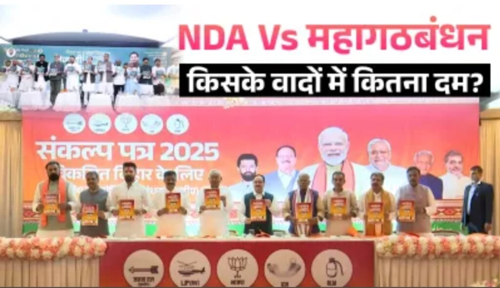 बिहार विधानसभा चुनाव 2025 के महासंग्राम में अब घोषणापत्रों का दौर शुरू हो गया है।एनडीए और महागठबंधन — दोनों ही गठबंधनों ने अपने-अपने वादों का पिटारा खोल दिया है।कहीं ‘तेजस्वी के 10 प्रण’ की गूंज है तो कहीं ‘नीतीश का संकल्प पत्र’ सुर्खियाँ बटोर रहा है।दोनों गठबंधनों ने युवाओं, महिलाओं, किसानों और गरीब तबके को ध्यान में रखकर वादों की ऐसी फेहरिस्त पेश की है, जिसने जनता के बीच नई चर्चा छेड़ दी है।
