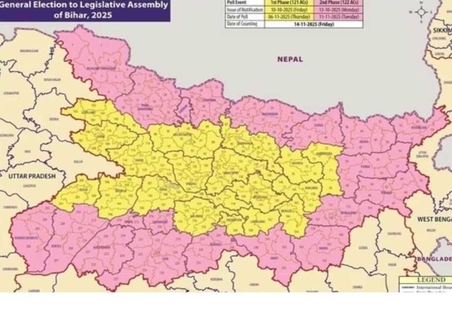 बिहार विधानसभा चुनाव की रणभेरी बज चुकी है। भारत निर्वाचन आयोग ने मंगलवार को बिहार में विधानसभा चुनाव के कार्यक्रमों का औपचारिक ऐलान कर दिया। पहले चरण के लिए मतदान 6 नवंबर और दूसरे चरण के लिए 11 नवंबर तय किया गया है। राज्य के सभी 243 विधानसभा क्षेत्रों में मतदान दो चरणों में संपन्न होगा, जबकि मतगणना 14 नवंबर को की जाएगी।मुख्य चुनाव आयुक्त ज्ञानेश कुमार ने संवाददाता सम्मेलन में कहा कि छठ महापर्व का खयाल रखते हुए मतदान की तारीखें तय की गई हैं। इस बार बिहार के करीब 7.42 करोड़ मतदाता लोकतंत्र की इस महापर्व में हिस्सा लेंगे, जिनमें 3.92 करोड़ पुरुष और 3.50 करोड़ महिलाएं शामिल हैं। इनमें से 14 लाख मतदाता पहली बार वोट डालेंगे।चरणबद्ध चुनाव प्रक्रियापहला चरण:मतदान की तिथि: 6 नवंबर 2025कुल सीटें: 121जिले: गोपालगंज, सीवान, बक्सर, सारण, मुजफ्फरपुर, दरभंगा, सहरसा, मधेपुरा, खगड़िया, मुंगेर, लखीसराय, शेखपुरा, नालंदा, पटना, वैशाली, समस्तीपुर, बेगूसराय, भोजपुरदूसरा चरण:मतदान की तिथि: 11 नवंबर 2025कुल सीटें: 122जिले: पश्चिम चंपारण, पूर्वी चंपारण, शिवहर, सीतामढ़ी, मधुबनी, सुपौल, अररिया, किशनगंज, पूर्णिया, कटिहार, भागलपुर, बांका, जमुई, नवादा, गया, जहानाबाद, अरवल, औरंगाबाद, रोहतास, कैमूर (भभुआ)महत्वपूर्ण तिथियां:पहले चरण: नामांकन की अंतिम तिथि 17 अक्टूबर, नामांकन पत्रों की जांच 18 अक्टूबर, नाम वापस लेने की अंतिम तिथि 20 अक्टूबरदूसरे चरण: अधिसूचना 13 अक्टूबर, नामांकन की अंतिम तिथि 20 अक्टूबर, जांच 21 अक्टूबर, नाम वापसी 23 अक्टूबरचुनाव की तैयारियों की हेडलाइनइस बार बिहार में लगभग 8.5 लाख चुनाव कर्मी मतदान सुनिश्चित करेंगे।सभी 243 विधानसभा सीटों पर एक जनरल और एक पुलिस पर्यवेक्षक तैनात रहेंगे। ये सभी अन्य राज्यों से आएंगे ताकि निष्पक्ष निगरानी हो।मतदाता 1950 हेल्पलाइन और ECINET एप के माध्यम से अपने मुद्दों और शिकायतों को सीधे चुनाव अधिकारियों तक पहुंचा सकते हैं।सभी बूथ भवन ग्राउंड फ्लोर पर होंगे, और दिव्यांगों के लिए 40% विशेष व्यवस्था होगी। चुनाव में नई तकनीक और सुविधाएंईवीएम में उम्मीदवारों की तस्वीर रंगीन और क्रम संख्या का फॉन्ट बड़ा होगा।उम्मीदवार अब 100 मीटर की दूरी पर अपना हेल्प सेंटर खोल सकते हैं।बिहार के चुनावों में हर बूथ पर वेबकास्टिंग, डिजिटल इंडेक्स कार्ड, और वन स्टॉप डिजिटल प्लेटफॉर्म जैसी आधुनिक सुविधाएं लागू होंगी।चुनाव आयोग ने फेक न्यूज पर कड़ी कार्रवाई करने का भी ऐलान किया। सुरक्षा और समन्वयसीमा क्षेत्रों और संवेदनशील इलाकों में सुरक्षा व्यवस्था सुदृढ़ की गई है।मुख्यमंत्री नीतीश कुमार ने मुजफ्फरपुर में लगभग 300 करोड़ की योजनाओं का शिलान्यास और उद्घाटन किया, जिससे क्षेत्रीय विकास और चुनावी संतुलन पर ध्यान दिया गया।चुना