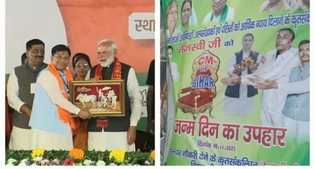 पीएम मोदी ने अपने भाषण में तेजस्वी यादव का अप्रत्यक्ष नाम लेते हुए कहा—“कल 9 नवंबर को उनका जन्मदिन है, जनता इस बार उन्हें एक खास गिफ्ट देने वाली है।”इस बयान के बाद सियासी गलियारों में चर्चाओं का बाजार गर्म है। उधर पटना की सड़कों पर “सीएम चेयर गिफ्ट” के पोस्टर पहले ही चर्चा में हैं, जिन्हें लेकर एनडीए बनाम महागठबंधन का मुकाबला और दिलचस्प हो गया है।पहले चरण का ‘65 वोल्ट का झटका’