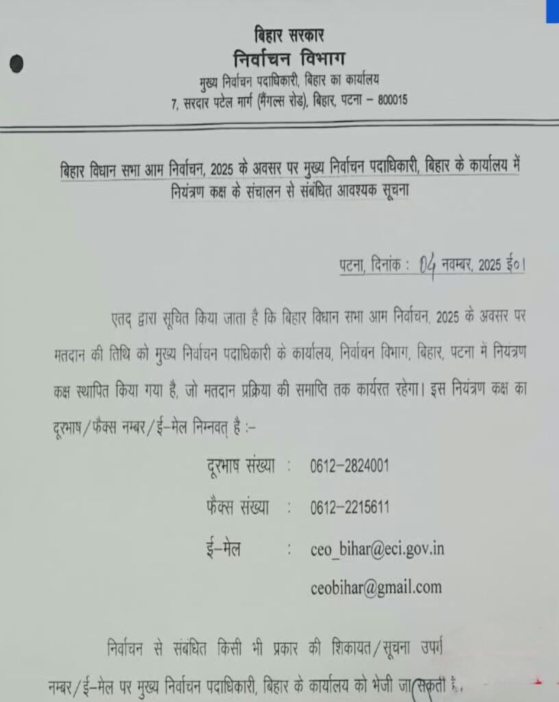निर्वाचन पदाधिकारी ने मतदाताओं से अपील की है कि वे निर्भय होकर मतदान करें, और यदि किसी बूथ पर कोई गड़बड़ी, दबाव, धन या शराब के प्रलोभन जैसी गतिविधि दिखे, तो तुरंत ऊपर दिए गए नंबरों या ई-मेल पर सूचना दें।📰 संक्षेप में: मतदान की तारीख: 6 नवंबर (पहला चरण)सीटें: 121जिले: 18कंट्रोल रूम: सीईओ दफ्तर, पटनानतीजा: 14 नवंबर