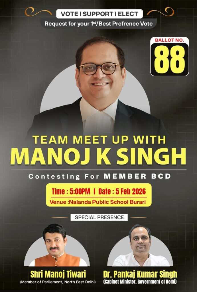 वर्तमान में मनोज कुमार सिंह बीसीडी बार एसोसिएशन काउंसिल के चुनावी मैदान में हैं। उनकी टीम को बैलेट नंबर 88 आवंटित किया गया है। विधि समुदाय के भीतर उनके अनुभव, संगठनात्मक दृष्टिकोण और न्यायिक व्यवस्था को अधिक प्रभावी बनाने के विचारों को लेकर चर्चा हो रही है।वरिष्ठ अधिवक्ता अरविंद कुमार सिंह का कहना है कि मनोज कुमार सिंह ने अपने पेशेवर जीवन में सहयोग और समर्पण की भावना को प्राथमिकता दी है। उनके अनुसार, विधि समाज में ऐसे व्यक्तित्व संगठनात्मक मजबूती के लिए महत्वपूर्ण होते हैं।