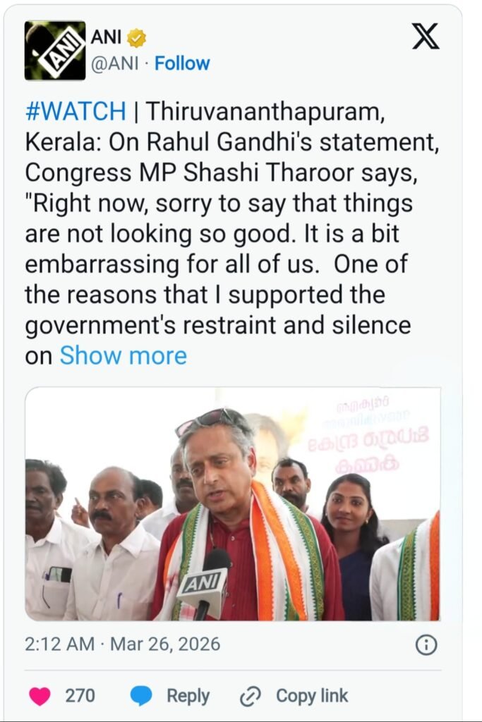 शशि थरूर ने कहा कि उन्होंने पहले सरकार के “संयमित रुख” का समर्थन किया था, इस उम्मीद के साथ कि भारत अपनी मजबूत कूटनीतिक स्थिति का इस्तेमाल करेगा।“मैं तीन हफ्तों से कह रहा हूं कि भारत को आगे आकर बातचीत शुरू करवानी चाहिए थी, लेकिन ऐसा नहीं हुआ।”उन्होंने यह भी स्पष्ट किया कि उनका बयान सरकार का समर्थन नहीं, बल्कि “राष्ट्रीय हित” के दृष्टिकोण से था।
