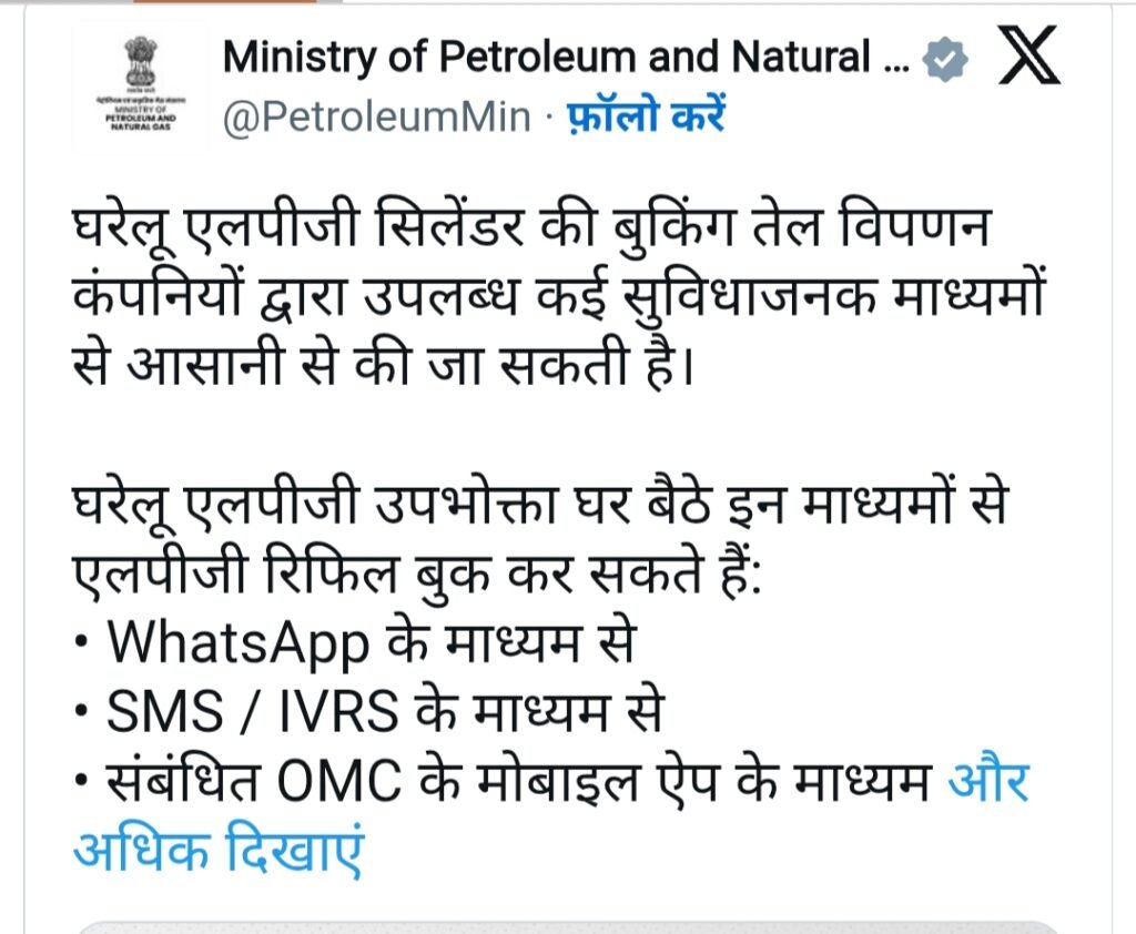 1. WhatsApp के माध्यम से बुकिंगतेल विपणन कंपनियों ने व्हाट्सएप के जरिए सिलेंडर बुक करने की सुविधा उपलब्ध कराई है। उपभोक्ता अपने रजिस्टर्ड मोबाइल नंबर से व्हाट्सएप पर संदेश भेजकर बुकिंग कर सकते हैं।